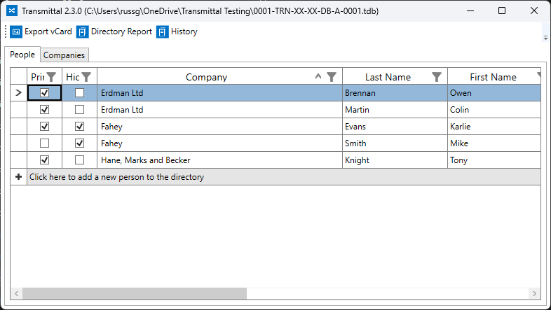 A project directory report can be generated for export to PDF, Word or Excel. The first column in the people datagrid determines whether or not that person appears on the directory report. The second column determines if the person appears in the transmittal distrubution list. Deselected people who may have left the project helps keep things manageable.